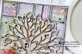 Взяла негатив от чипа от Artistic line в виде дерева, аккуратно вырезала его с припуском по контуру. Наклеив на основу так же немного прошлась фоновым текстовым штампом и добавила обводку черной ручкой.