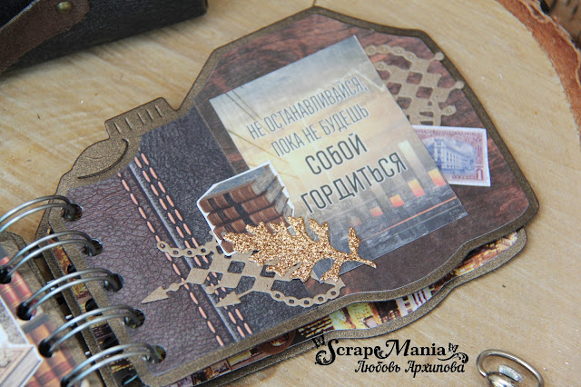 В наборе есть лист с карточками, на некоторых есть мотивирующие надписи. И вот с одной такой карточки и начинается мой альбом. Так же мне пригодились ножи Нож "Цинерария" и веточка из набора Нож "Усатый поваренок. Чайный сервиз". Ими я вырубила листики из глиттерного картона медного цвета. На этой страничке разместила кошелек и пару монет из Скрап-карты А4 "Мужчина на миллион. Детали".