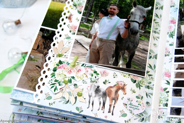 Шестой разворот вмещает фотографии с фотопрогулки. Тут только жених и невеста. У нас было какое-то время погулять и сделать красивые кадры. А когда я в далеке увидела лошадок, с восторженными криками "У меня есть бумага с лошадками", мы понеслись к ним. Такое совпадение, там лошади оказались такого же окраса, как и на бумаге и на высечках. На левой страничке кармашек и открывашка, а на правой страничке автоматический водопад.